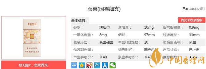 雙喜國喜細(xì)支煙支長97mm,過濾嘴長:33mm,拆開細(xì)長的煙支明顯煙絲經(jīng)過細(xì)心挑選,色澤金黃油亮,無煙梗及碎煙葉,煙葉發(fā)酵程度、膨脹程度以及煙葉包裹程度恰到好處。下面我們一起來看雙喜國喜細(xì)支的參數(shù)信息:焦油量:10mg 煙堿量:0.9mg 一氧化碳量:8mg