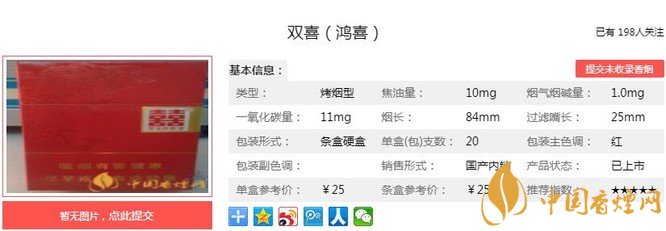 其所選用的煙葉全部來自于海拔1200米以上的山地生態(tài)煙葉,保證了原料上的優(yōu)越性,配以廣東中煙自主研發(fā)的三元復(fù)合濾嘴,起到了增香、保潤、提純的作用,使鴻喜產(chǎn)品的煙氣柔和綿長,口感圓潤生津,香氣飽滿透發(fā),真正做到了剛?cè)岵?。?jīng)香煙網(wǎng)小編市場調(diào)查雙喜鴻喜售價為25元/包。