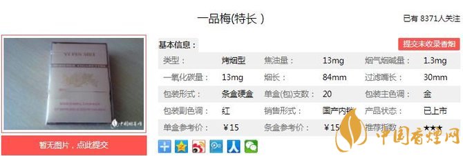 商標(biāo)主色調(diào)為金色,富麗堂皇,氣派尊貴; 香氣濃馥、悠長,煙氣豐滿細膩,層次感強,余味干凈舒適,口感純正,入喉舒適和順; 30mm超長濾嘴,有效降低煙氣中焦油、一氧化碳等有害物質(zhì)。經(jīng)香煙網(wǎng)小編市場調(diào)查一品梅特長售價為15元/包。