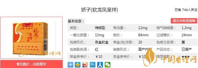 嬌子軟龍鳳呈祥煙支長84mm,過濾嘴長24mm,全面應(yīng)用具有自主知識產(chǎn)權(quán)、獲五項(xiàng)國家發(fā)明專利的復(fù)合生物制劑,以卟啉融合多種天然植物提取活性成分,可有效降低卷煙煙氣中四類十余種有害成分,是嬌子專利減害與配方技術(shù)完美結(jié)合的體現(xiàn)。下面我們一起來看嬌子軟龍鳳呈祥的參數(shù)信息:焦油量:12mg 煙堿量:1.2mg 一氧化碳量:13mg