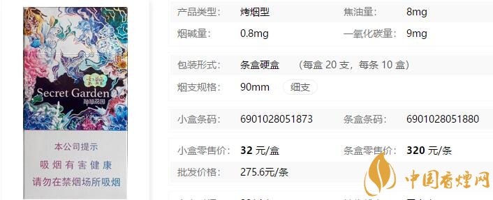 云煙(神秘花園)煙支長:90mm,烤煙型,包裝形式:條盒硬盒(每盒 20 支,每條 10 盒)。超細(xì)支的整體形式更凸顯產(chǎn)品的細(xì)致、優(yōu)雅、個性獨一,整個版面色調(diào)以紫羅蘭色為基礎(chǔ)色,藍(lán)、紅色為其點綴,凸顯設(shè)計的高貴、神秘。下面我們一起來看云煙(神秘花園)的參數(shù)信息:焦油量:8mg 煙堿量:0.8mg 一氧化碳量:9mg
