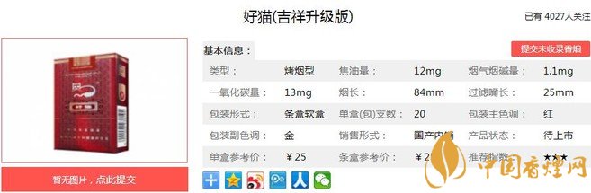 好貓吉祥升級版煙支長84mm,過濾嘴長25mm,添加中草藥提取物“豐和液”,在保留煙草本香的同時(shí)有效降低主流煙氣中的各項(xiàng)有害物質(zhì)指標(biāo),提高卷煙的吸食安全性。下面我們一起來看好貓吉祥升級版的參數(shù)信息:焦油量:11mg 煙堿量:1.1mg 一氧化碳量:13mg