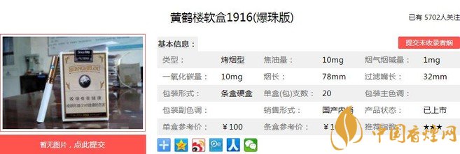 利群夜西湖煙支長78mm,過濾嘴長32mm,土豪金濾嘴彰顯高貴的品質(zhì),煙絲的切工精細(xì)整齊,填充度也不錯(cuò),輕捏彈性十足。下面我們一起來看黃鶴樓軟盒1916(爆珠版)的參數(shù)信息:焦油量:10mg 煙堿量:1.0mg 一氧化碳量:10mg