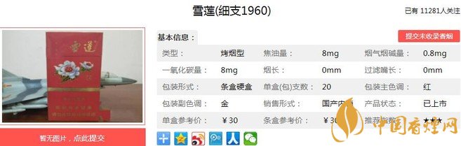 “雪蓮(細(xì)支1960) ”取名寓意為紀(jì)念新煙于1960年建廠,煙葉選料精良,突出煙草本香,增加抽吸的層次感和豐富性。雪蓮(細(xì)支1960)新品以過硬的質(zhì)量水平,3月份在新疆卷煙廠完成封箱工作,標(biāo)志該牌號卷煙正式落地新煙。經(jīng)香煙網(wǎng)小編市場調(diào)查雪蓮細(xì)支1960售價為30元/包。