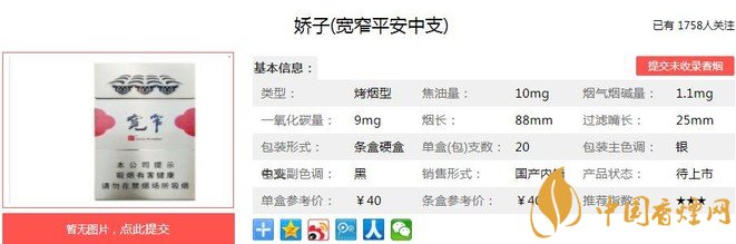 做為寬窄系列家族新成員,嬌子(寬窄平安中支)也已登臺(tái)亮相。在寬版粗支、細(xì)支、短支等測(cè)試版本之后,最終推出了中支版本的平安,并在2018年驚艷上市。味道傳承了寬窄系列的細(xì)膩典雅,又有其自身的溫潤(rùn)柔媚,是一款質(zhì)高價(jià)美的卷煙產(chǎn)品。經(jīng)香煙網(wǎng)小編市場(chǎng)調(diào)查嬌子(寬窄平安中支)售價(jià)為40元/包。