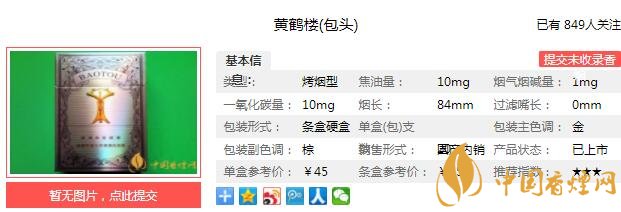 黃鶴樓包頭煙支長84mm,黃色水松紙上打有一排激光孔,濾嘴上有包頭市徽?qǐng)D案和BAOTOU的拼音煙,身也有刻度線,綠線是3,黃線是5。下面我們一起來看黃鶴樓包頭的參數(shù)信息:焦油量:10mg 煙堿量:1.0mg 一氧化碳量:10mg