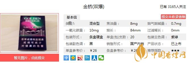 金橋雙爆煙支長(zhǎng)84mm,過(guò)濾嘴長(zhǎng)25mm,創(chuàng)新使用了全新的爆珠添加工藝:在一臺(tái)濾棒機(jī)上錯(cuò)位置入兩種爆珠,一次成型,效率大大提高的同時(shí),保持了定位的精確性和爆珠的品質(zhì)穩(wěn)定性。下面我們一起來(lái)看金橋雙爆的參數(shù)信息:焦油量:8mg 煙堿量:0.7mg 一氧化碳量:10mg