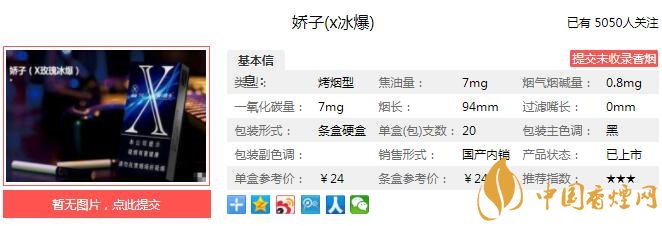 嬌子X冰爆煙支長(zhǎng)94mm,過濾嘴長(zhǎng)35mm,過濾嘴頂端是普通的海綿體結(jié)構(gòu),并無瓦楞槽,過濾嘴一側(cè)印有爆珠的標(biāo)識(shí),另一側(cè)印有X的LOGO,煙支整體比較精美。下面我們一起來看嬌子X冰爆的參數(shù)信息:焦油量:7mg 煙堿量:0.8mg 一氧化碳量:7mg