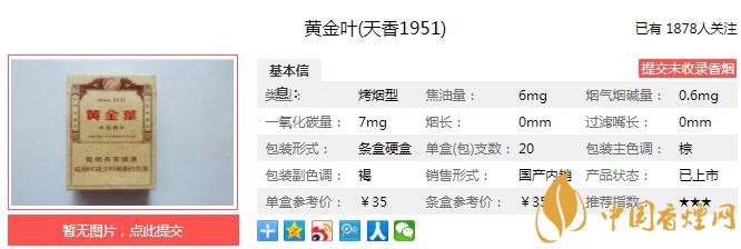 黃金葉天香1951從字面上理解和其本色本香的煙味應(yīng)該是向創(chuàng)牌于1951年“黃金葉”品牌的烤煙傳統(tǒng)致敬,自然本香、尊貴天香、高香低害、舒適輕松、本色包裝、傳承經(jīng)典,古色簡(jiǎn)約的包裝風(fēng)格同時(shí)也是對(duì)于經(jīng)典的傳承。經(jīng)香煙網(wǎng)小編市場(chǎng)調(diào)查黃金葉天香1951售價(jià)為35元/包。
