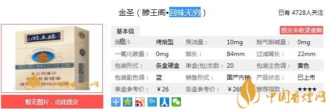 以上便是由香煙網(wǎng)小編為大家介紹的關(guān)于金圣(滕王閣·回味無(wú)窮)多少錢一包 回味無(wú)窮口感及參數(shù)介紹的相關(guān)信息,想要了解更多有關(guān)內(nèi)容請(qǐng)點(diǎn)擊:阿里山香煙好抽嗎 六款阿里山香煙口感分析
