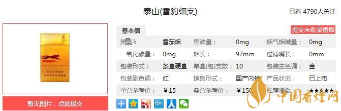以優(yōu)質(zhì)進(jìn)口雪茄煙葉的上部煙葉為原料,融合現(xiàn)代雪茄制作工藝,大大提高吸食滿足感。從天然本草中提取香料,采用獨(dú)特的二元加料技術(shù),充分發(fā)揮香精香料的修飾作用,在強(qiáng)化風(fēng)格的同時(shí)豐富吸味和口感。經(jīng)香煙網(wǎng)小編市場(chǎng)調(diào)查泰山雪豹細(xì)支售價(jià)為15元/包。