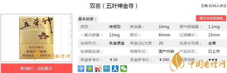 以上便是香煙網(wǎng)小編為大家介紹的關(guān)于當年引領(lǐng)降焦潮流的五葉神金尊,現(xiàn)在價格只需要26元一包!的相關(guān)信息,看完之后大家是不是對于雙喜(五葉神金尊)的相關(guān)信息更加了解呢。大家還想查詢更多的相關(guān)內(nèi)容歡迎點擊:五葉神譽品香煙多少錢一包 五葉神譽品香煙價格30元/包