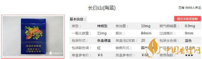 長白山(海藍(lán))的性價(jià)比較高,海藍(lán)色的濾嘴顯得十分好看,抽起來的時(shí)候煙氣正好?,F(xiàn)在產(chǎn)品復(fù)出雖然無法全部找到當(dāng)年的產(chǎn)品回憶,但是焦油量還是非常值得肯定的。下面便是長白山(海藍(lán))的基本參數(shù):焦油量:10mg 煙堿量:0.9mg 一氧化碳量:11mg.