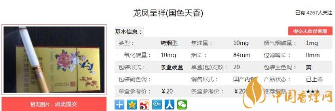 這款香煙左右兩側(cè)為紅色,分為三段式設(shè)計(jì):上下兩段有波浪紋飾的暗紋,左側(cè)是全部為10mg和1.0mg的理化指標(biāo)。白色豎紋卷煙紙上無編碼與文字,拆開煙支,在濾嘴處有兩排激光降焦孔。煙支長(zhǎng)84mm,濾嘴占去37mm。下面便是龍鳳呈祥(國(guó)色天香)的基本參數(shù):焦油量:10mg 煙堿量:1.0mg 一氧化碳量:10mg.