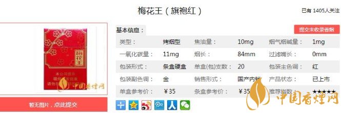 梅花王(旗袍紅)定價(jià)是在35元一包,這樣的價(jià)格在梅花王香煙里面,還是算比較高的。跟另外一款梅花王(硬紅)的價(jià)格齊平,想抽這款香煙的朋友,可以考慮這一款香煙,各方面的感覺也口感都是不錯(cuò)的。