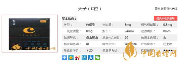 天子(C位)這款香煙,目前的售價是20元一包。這款香煙從上市以來的感覺,反響并不是非常好,可能是因?yàn)橹貞c中煙宣傳的不要到位吧。口感上面,這款香煙的口感并不是非常的典型,有些人覺得抽的舒服有些人覺得不能接受,具體還是看個人口味,價格方面這款香煙的不算貴的。