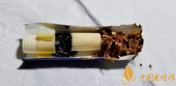 剖開濾嘴,連活性炭段,濾嘴是四段。最外側是一段中空硬化濾嘴,這個技術來源于BAT,目前國內(nèi)很多煙廠在其中高端款型上都有采用。從活性炭段前后的絲束段顏色來看,稍稍淺黃,顏色均勻,煙氣的流速和空氣導入效果不錯,活性炭的過濾和穩(wěn)流作用不錯。