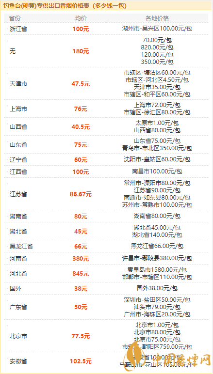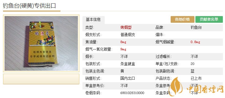 以上就是香煙網(wǎng)為您提供的釣魚臺硬黃香煙基本信息和2020釣魚臺(硬黃)專供出口香煙價格表,想要知道更多關(guān)于香煙的信息,請時刻關(guān)注香煙網(wǎng)。