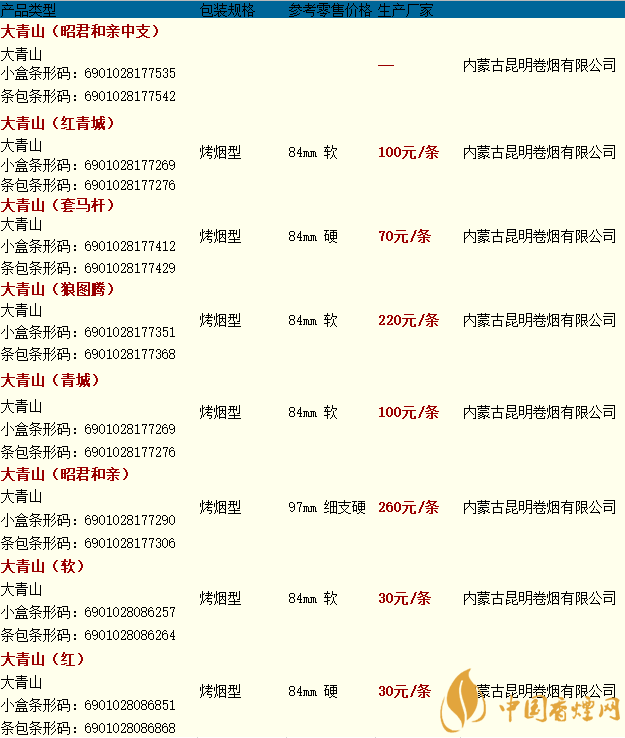 大青山香煙品牌包括了,大青山(軟),大青山(紅)等。