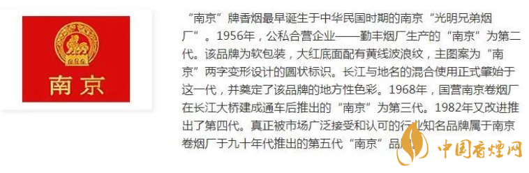 1995年,1995年南京品牌卷煙銷量為2.3萬箱。“南京”被評(píng)為“江蘇五大名煙”,與具有自主知識(shí)產(chǎn)權(quán)的低焦油“夢(mèng)都”一起成為南京卷煙廠步入跨躍式發(fā)展之路的兩艘巨輪。
