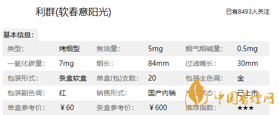 利群(軟春意陽光)采用國內頂級的降焦技術,配以一級香煙原料精心調制而成。它是國內低烤香煙中的經(jīng)典高端之作。它的焦含量僅為5mg,香煙品質卓越,煙香飄逸,口感醇香怡人,深受高端消費群體的青睞。據(jù)小編調查得知市場售價為60元/包。