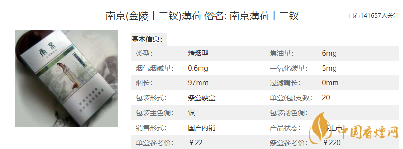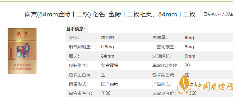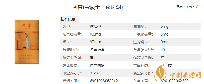 價格:28元/包,這款南京(金陵十二釵烤煙)是金色的包裝,這也是銷量最好的一款香煙,這款香煙是細(xì)支香煙,柔和但煙氣飽滿純正,沒有其他細(xì)支寡淡的感覺。6mg的焦油含量屬于低焦香煙。