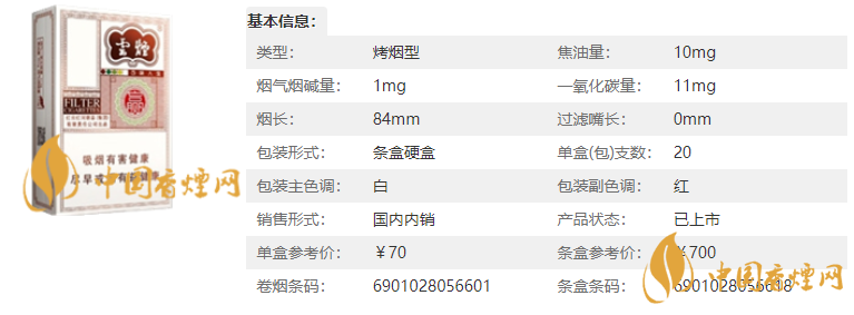 | 類(lèi)型 :烤煙型 | 焦油量 :10mg | 煙氣煙堿量 :1mg | 一氧化碳量 :11mg |