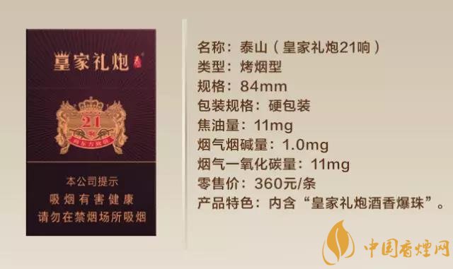 泰山(皇家禮炮21響)是山東中煙秉承中西禮儀文化,運用創(chuàng)新科技精心打造。不僅有著豐富的文化內涵,而且產(chǎn)品極具特點,在濾嘴中添加了“皇家禮炮21年”頂級威士忌的爆珠。泰山煙新品多少錢?2018皇家禮炮21響多少錢一盒 皇家禮炮21響香煙售價36元/包