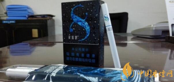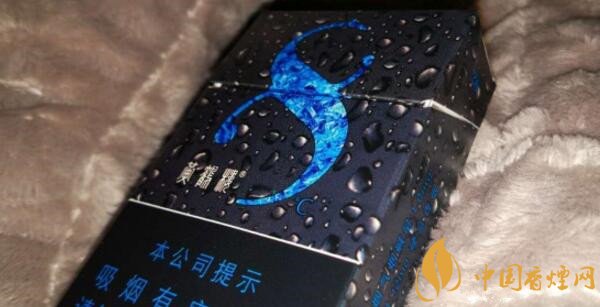 這款香煙正面外觀來看給人的第一印象它就是一款涼煙,炫酷純黑的底色搭配晶亮水滴為主色調(diào),同時(shí)冰藍(lán)顏色的抽象冰塊圖案形成了一個(gè)數(shù)字“8”形狀,讓人覺得涼爽的同時(shí)也突出了產(chǎn)品LOGO。