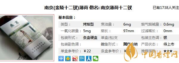 南京卷煙是江蘇中煙南京卷煙廠的代表品牌,而南京薄荷味香煙就是南京(金陵十二釵)薄荷,“金陵十二釵”香煙由南京卷煙廠在1988年出品,是非常少見的12包裝成套系列的產(chǎn)品,在煙標(biāo)收藏界,這套融詩、書、畫于一體的“金陵十二釵”被視為設(shè)計(jì)最精美的煙標(biāo),那么在對南京薄荷味香煙價(jià)格圖片分析之前,先來看看這款南京薄荷味香煙多少錢,它的售價(jià)為22元/包。