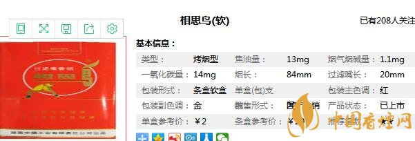 相思鳥(niǎo)(軟)香煙,從品牌知名度來(lái)看,相思鳥(niǎo)和紅豆獲得過(guò)各種獎(jiǎng)項(xiàng),在消費(fèi)者心目中也有較好口碑。售紅火的時(shí)候,京廣鐵路沿線省份都可以見(jiàn)到相思鳥(niǎo)的身影。