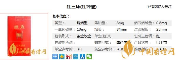 紅三環(huán)香煙是安徽中煙工業(yè)公司滁州卷煙廠于1984年創(chuàng)立的,當(dāng)時品牌立意為紀(jì)念中國女排在世界大賽中連續(xù)獲得三次世界冠軍,三環(huán)象征著三連冠,紅三環(huán)香煙被賦予了新的寓息,象征著廠家、商家和消費者心心相印,緊密相連。那么在介紹紅鐘鼎香煙價格表之前,先來看看這款紅鐘鼎煙多少錢一包,這款香煙的售價為3元/包。