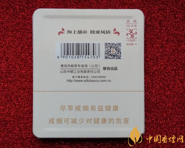 泰山(3G原味)采用3D鐵盒裝置,以青島五四廣場的建筑性標(biāo)志為主圖背景,突出青島這座海山都市獨有的文化底蘊(yùn)。它的焦含量中等,煙香馥郁芬芳中夾帶著些許的甜潤感,吸味醇正細(xì)膩,簡約而時尚個性的外觀,深受時尚界煙客的喜愛。為了對這款泰山雪茄型香煙價格有一個詳細(xì)的了解,先來看看這款泰山雪茄多少錢一盒?據(jù)小編調(diào)查得知市場售價為25元/包。