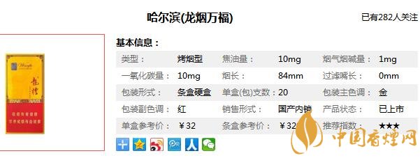 哈爾濱卷煙廠,是我國最早建立的一個卷煙廠,是我國歷史最老的廠之一,因?yàn)檫@個品牌的產(chǎn)品地域性要求非常的高,以至于這個品牌在當(dāng)今的發(fā)展趨勢下,逐步走向沒落,那么龍煙福萬多少錢一包,現(xiàn)在就由香煙網(wǎng)小編為大家介紹一下哈爾濱龍煙萬福價格圖片。