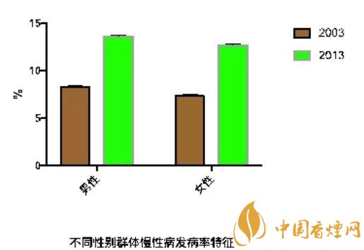 研究結(jié)果顯示,2003年,2008年以及2013年我國的煙民比例分別為26.0%,24.9%,25.2%,始終高居不下。2003年,男性煙民的數(shù)量相對較高(48.4%)。女性群體的煙民比例則相對較低(3.1%)。