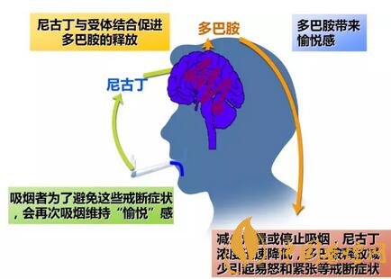 吸煙讓人興奮甚至成癮的源頭在于煙草中的尼古丁,吸煙后尼古丁進(jìn)入體內(nèi),會經(jīng)由血液傳送,大約7秒即可到達(dá)腦部。尼古丁與大腦的乙酰膽堿α4β2受體結(jié)合后,會激活大腦的“獎勵中心”,釋放大量的多巴胺,多巴胺是一種促進(jìn)人體腎上腺素分泌的神經(jīng)遞質(zhì),其濃度的提高是人感到開心、興奮等情緒的來源。