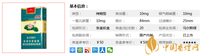 | 類型 :烤煙型 | 焦油量 :10mg | 煙氣煙堿量 :10mg | 一氧化碳量 :10mg |