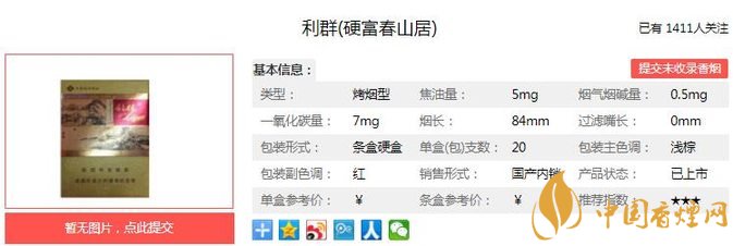 利群硬富春山居煙支長84mm,過濾嘴長不詳,杭州富春江畔之自然人文氣韻產(chǎn)品采用浙江新昌稀有香料煙葉配方調(diào)制,以多門獨有技術(shù)實現(xiàn)不加香不加料富春山居利群:純煙葉打造 華夏第一支。下面我們一起來看利群硬富春山居的參數(shù)信息:焦油量:5mg 煙堿量:0.5mg 一氧化碳量:7mg