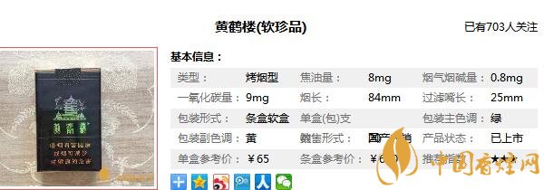 黃鶴樓(軟珍品)號稱是湖北軟中華,先是只外銷后才轉為內銷的。在60元檔烤煙市場與芙蓉王的軟藍、云煙棕印象號稱三杰。與霸主軟中華可以一較高下。經香煙網小編市場調查黃鶴樓(軟珍品)售價為65元/包。