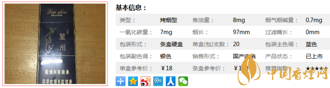 | 類(lèi)型 :烤煙型 | 焦油量 :8mg | 煙氣煙堿量 :0.7mg | 一氧化碳量 :7mg |