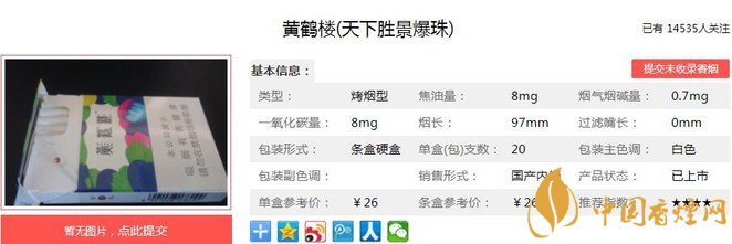 湖北中煙對這種極具中國特色爆珠味道的探索并沒有停止,在他們?nèi)卤楫a(chǎn)品——黃鶴樓(硬天下勝景)中,更是將極具中國風(fēng)味特色的鳳頭姜提取物,作為爆珠添加的天然原料,以此形成的姜味爆珠,成為全國獨(dú)創(chuàng)。經(jīng)香煙網(wǎng)小編市場調(diào)查黃鶴樓天下勝景爆珠售價(jià)為26元/包。