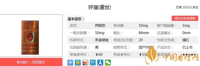 好貓盛世以高香低危害為主要設(shè)計方向,主要原料精心選用自然醇化兩年以上的云南、津巴布韋煙葉,突出產(chǎn)品優(yōu)雅的清香,煙香豐富諧調(diào)。在香料配方中首次采用具有生物減害技術(shù)的中草藥“豐和液”,使有害氣體得以轉(zhuǎn)移降解,達到了“生津不起痰,回甜不口干”的良好效果。經(jīng)香煙網(wǎng)小編市場調(diào)查好貓盛世售價為60元/包。