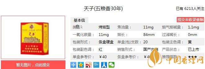天子五糧香30年包裝盒正中間是稻谷、小麥、玉米、高粱、大豆的圖案,也就是所謂的內含五糧香珠的“五糧”,香煙吸味上純粹五糧香,口感甘甜、味道醇厚,深受廣大煙民的喜歡。經香煙網小編市場調查天子五糧香30年售價為40元/包。
