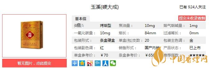 大成玉溪,匯集紅塔人50年造煙智慧和工藝,背負著500年的歷史使命,開創(chuàng)中式卷煙“清香盛世”。大成玉溪,以其八部天香,構(gòu)筑世紀清香經(jīng)緯;煙支的絲縷之間,都浸透了自然的靈性與科技的精妙。八部天香,以藝術(shù)的節(jié)奏,完成對清香的詮釋,重新定義中式卷煙清香標準。經(jīng)香煙網(wǎng)小編市場調(diào)查玉溪硬大成售價為70元/包。