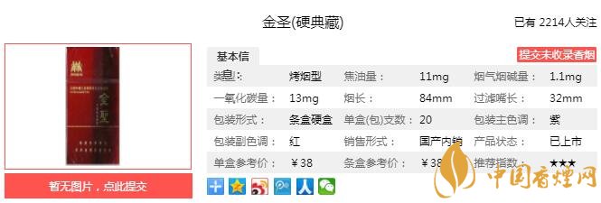 秉承自然靈秀之氣,形神俱清:選用國內云貴高原小產區(qū)清香型優(yōu)質煙葉和世界著名煙葉產區(qū)名貴煙葉,復烤后選用最醇和之中部,經天然山東儲藏三年以上。本草萃香,優(yōu)雅飄逸: 配以第二代“金圣香”本草萃取精華和美國IFF香精香料精調而成。煙氣整體平衡協(xié)調,想起優(yōu)雅飄逸、自然醇和、透發(fā)感極強。經香煙網小編市場調查金圣典藏售價為38元/包。