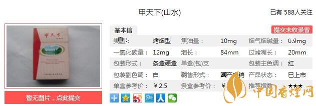 甲天下山水煙支長84mm,過濾嘴長20mm,水松紙斑狀米黃色,卷紙潔白,切口整齊。下面我們一起來看甲天下山水的參數(shù)信息:焦油量:10mg 煙堿量:0.9mg 一氧化碳量:12mg