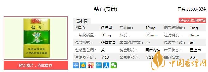 鉆石(軟綠)在繼承綠石2代風(fēng)格特點(diǎn)的基礎(chǔ)上,重點(diǎn)在煙香的醇和飽滿、口感的甜潤舒適上進(jìn)行提升,進(jìn)一步突出了“醇甜香”的品類特征,葉組配方精選云南、巴西、津巴布韋優(yōu)質(zhì)烤煙,添加新型功能香料,采用特殊工藝處理,強(qiáng)化風(fēng)格特色。經(jīng)香煙網(wǎng)小編市場調(diào)查鉆石軟綠售價(jià)為13元/包。