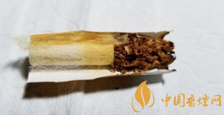剖開濾嘴,降焦孔開在了一段式絲束的前1/3段。由于煙氣量充裕的關(guān)系,前段絲束顏色較深一些,后段淡黃,總體顏色變化均勻一致,空氣的導(dǎo)入效果明顯。