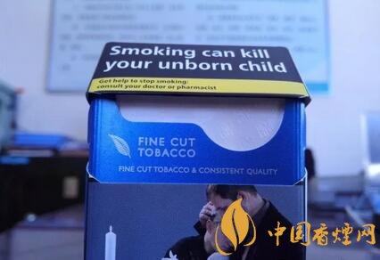 這是一款煙盒正反面均有警示圖片的版本,與單面警示圖片的法免藍駱駝還稍有區(qū)別。上文中的免稅GCC版本的精切紅L&M煙盒上的標識位于煙盒翻蓋處不同,法免藍是位于煙盒下方。FINE CUT字樣依然印制于煙盒的左下角。