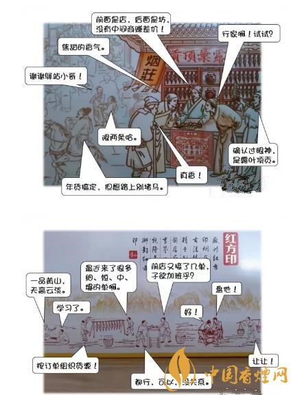 細(xì)看,正面的“前店”是一條古徽州商業(yè)街的圖樣,人頭攢動、熙熙攘攘,掛著“露葉頂貢”招牌的紅方印煙莊占據(jù)了C位,門口的“文幫”掌柜手持一片煙葉接受眾人圍觀;背面的“后坊”,則描繪了“武幫”的手工匠人們曬煙、制絲的勞作場景??上D案只能繪色、不能繪聲,假如身臨其境,會聽到什么樣的聲音呢?惡搞一下吧……